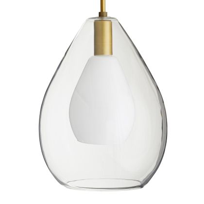 DOS TONOS DE VIDRIO SOPLADO A MANO FORMAN LA GOTA DE ESTE COLGANTE. DE DISEÑO APARENTEMENTE SIMPLE, UNA PANTALLA INTERIOR EN FORMA DE LÁGRIMA OCULTA UNA BOMBILLA ESTÁNDAR DE VIDRIO OPALINO, LUEGO UNA PANTALLA MÁS GRANDE DESCANSA FUERA DE ELLA, DEJANDO AL DESCUBIERTO LA PIEZA INTERIOR DE VIDRIO TRANSPARENTE. AMBOS CUELGAN DE UN VÁSTAGO Y UNA MONTURA DE ACERO INOXIDABLE, AMBOS CON ACABADO EN LATÓN ANTIGUO. TUBERÍA ADICIONAL DISPONIBLE (PIPE-180). TAMBIÉN DISPONIBLE EN NÍQUEL CEPILLADO (49174). CLASIFICADO PARA HUMEDAD, AUNQUE LAS CONDICIONES EXTERIORES CUBIERTAS LIMITADAS PUEDEN AFECTAR EL ACABADO.